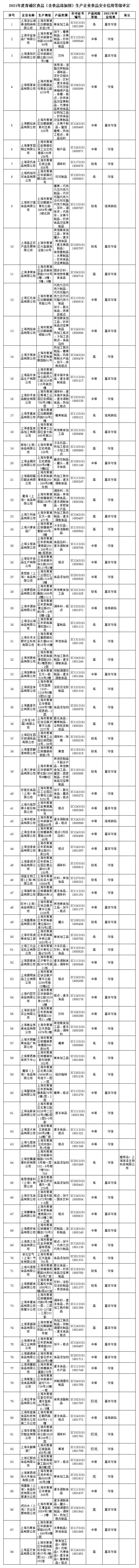 根據(jù)《上海市食品生產(chǎn)企業(yè)食品安全風(fēng)險(xiǎn)與信用分級(jí)監(jiān)管辦法》的要求,經(jīng)上海市食品安全工作聯(lián)合會(huì)組織相關(guān)專家,對(duì)2021年嘉定區(qū)食品生產(chǎn)企業(yè)食品安全信用等級(jí)進(jìn)行評(píng)定,現(xiàn)將評(píng)定結(jié)果公示如下: